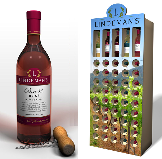 PrintBound commissioned BRANDesign to create an in-store merchandising solution for a range of Lindemans wine products. To ensure the proposal was presented to a high degree of realism, even the individual bottles were created as 3D elements and placed in the virtual display for the final rendered presentation.