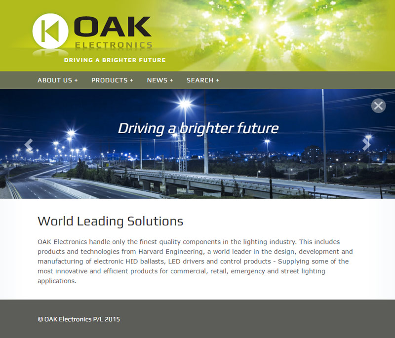 BRANDesign developed the original logo for the company which uses stylised character shapes from the word 'OAK' to represent a 'diode', which is one of the components in the equipment they manufacture. The colour represents the leaves of the oak tree symbolising strength and stability while reglecting the environmental sensibilities of the company.