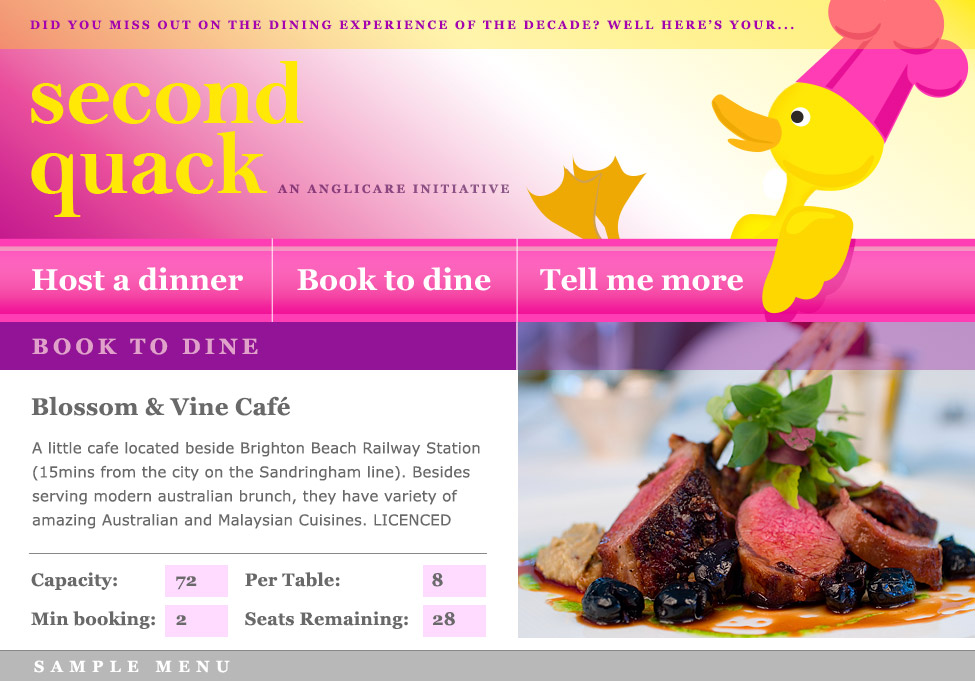 ...amongst many other projects, BRANDesign was instrumental in the marketing of ‘Second Quack‘, which was a fundraising initiative of Anglicare Victoria in response to the success of Heston Blumenthal’s 'Fat Duck' restaurant phenomenon.